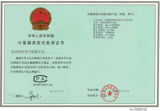 熱烈祝賀徐州依科電氣有限公司專利技術(shù)高精度智控矩陣電子皮帶秤EACCOR-B159獲得0國(guó)家0.2級(jí)計(jì)量證書(shū)CPA2018FC0011-32批準(zhǔn)證書(shū),配套高精度矩陣傳感器及矩陣智能稱重控制器(采用SEQ-AI智能算法,矩陣控制跟蹤復(fù)核技術(shù),...